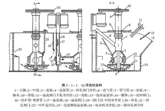 我国目前的浮选机主要分为:机械搅拌式浮选机、充气搅拌式浮选机和充气式浮选机。接下来就以XJ型机械搅拌式浮选机为例,其虽然型式较老,但在我国应用广泛,通过其我们可以来了解浮选机的工作原理图。