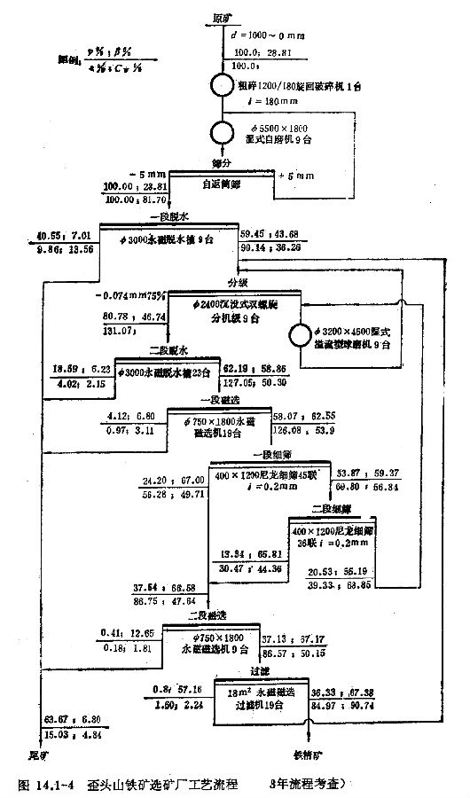 2、工艺流程:该厂是我国较早采用湿式自磨的磁选厂,多年来的生产实践证明,该厂采用的选矿工艺流程基本上是可行的,除自磨机处理量低于设计指标外,其余各项生产指标均达到或接近设计指标。工艺流程见图14.1-4。