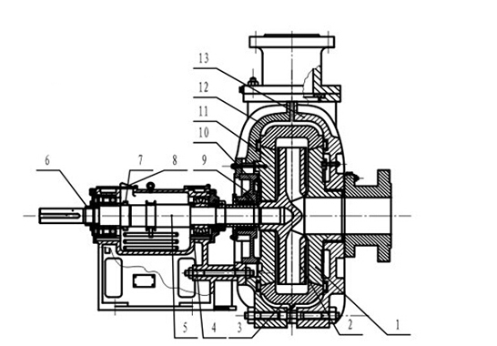 如图所示,各个数字所代表的渣浆泵配件名称如下:数字1为前护板,数字2为叶轮,数字3为护套。数字4为托架体,数字5为轴,数字6为螺母乙,数字7为调整螺母甲,数字8为调整孔盖,数字9为减压盖,数字10为付叶伦,数字11为后护板,数字12为泵体,数字13为泵盖,其中数字2和12所代表的叶轮和泵体是渣浆泵重要的配件,对运输工作的运行发挥着至关重要的作用。在电动机的作用下,叶轮高速旋转,同时带动叶片旋转将固液混合物甩出,以完成山西渣浆泵的压水过程。在这过程中叶轮速度大,产生较大的离心力,以使叶轮上的叶片发挥主要作用。为减少摩擦损失,要求叶轮的内外表面光滑。泵体又称为渣浆泵的外壳,与叶轮一样是水泵的主要配件,对整个机体起到支撑作用。