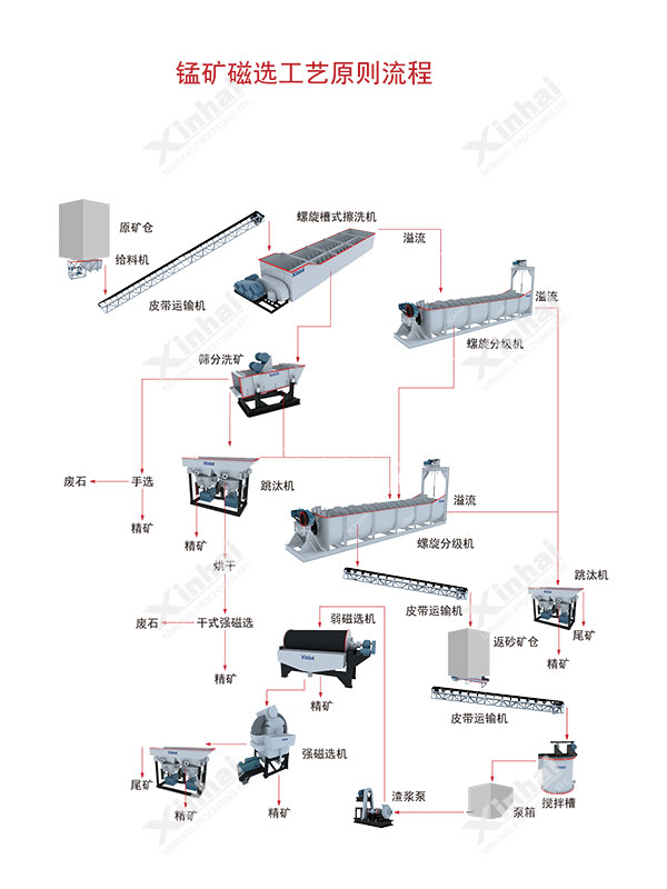 冰球突破首先采用锰矿专用强磁选机初步去除锰矿中的杂质,粗选精矿采用螺旋分级机分级,粗选尾矿直接排至尾矿浓缩机。