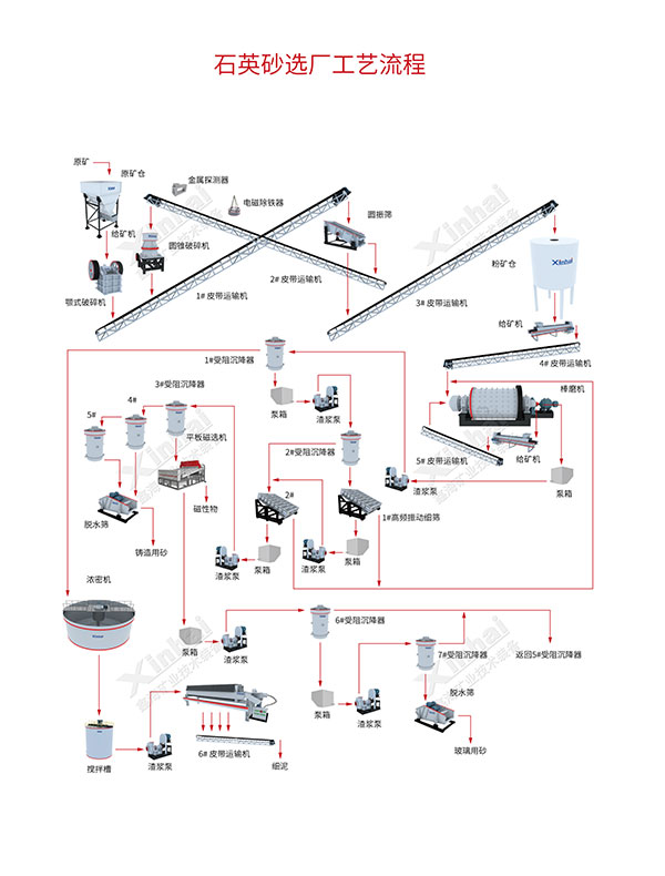 石英砂中的SiO2的品位随着石英砂粒度的变细而降低,杂质矿物的品位则相反,这种现象在含有大量粘土性矿物的石英砂中尤为明显,所以在入选前对石英砂原矿进行水洗、脱泥是非常必要的。