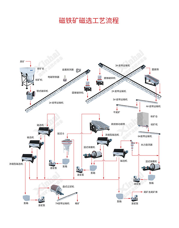 根据矿石的磁性强弱选择适应其性质的选矿工艺方法,使用磁选工艺为主要的工艺方法,配合重选、浮选、焙烧磁选等组合为联合流程方法,矿石选别分离有依据。